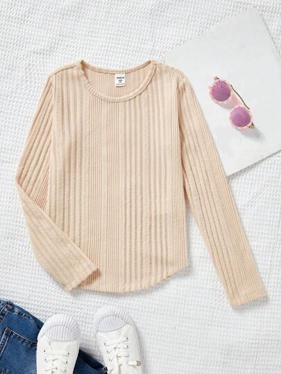 SHEIN Tween Girl Ribbed Knit Curved Hem Tee - Apricot - View 1