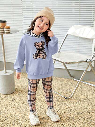 SHEIN Young Girl Bear Print Drop Shoulder Hoodie & Plaid Leggings - Blue - View 1