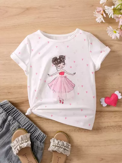 SHEIN Young Girl White Heart And Cartoon Graphic Casual Sweet T-Shirt With Round Neck And Short Sleeves For Summer,Holiday,Summer,Travel - White - View 1