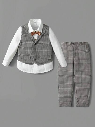 Young Boy Bow Front Shirt & Plaid Waistcoat & Pants - Multicolor - View 1