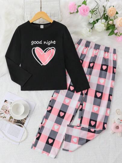 SHEIN Girls' Heart & Letter Print Long Sleeve Top And Pants Pajama Set - Multicolor - View 1