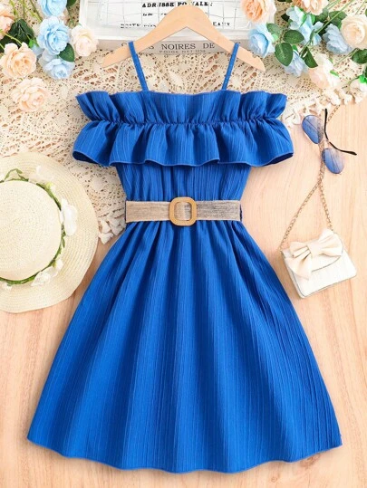 SHEIN Tween Girl Cold Shoulder Ruffle Trim Belted Dress - Blue - View 1