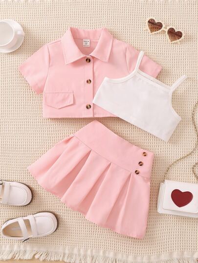 Young Girl Flap Detail Shirt & Pleated Skirt & Cami Top - Multicolor - View 1