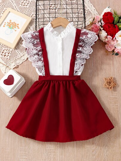2pcs Young Girl Ruffled Lace Front Button Elegant Set - Red and White - View 1