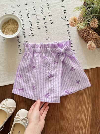 SHEIN LMoss Kids Baby Girl Casual Striped Bow Print Wrap Shorts, Summer - Purple - View 1
