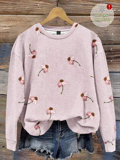 SHEIN LUNE Casual Minimalist Faux Fur Beaded Daisy Print Crew Neck Loose Fit Women Sweatshirt, Suitable For Autumn/Winter - Multicolor - View 1