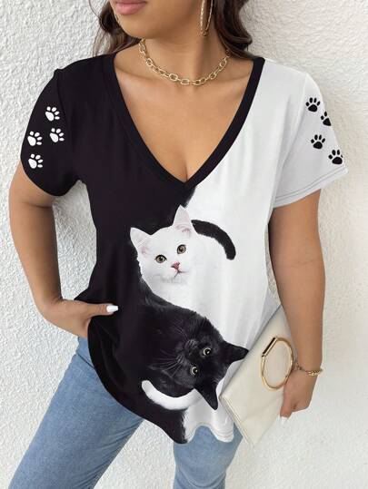 SHEIN LUNE Contrast Color Cat Animal Print Plus Size Short Sleeve T-Shirt - Multicolor - View 1