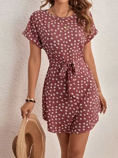 SHEIN LUNE Ditsy Floral Print Batwing Sleeve Belted Dress - Redwood - View 1
