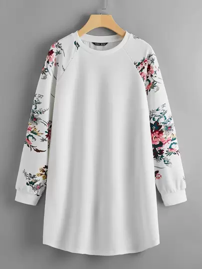 SHEIN LUNE Floral Print Raglan Sleeve Curved Hem Tee Dress - White - View 1