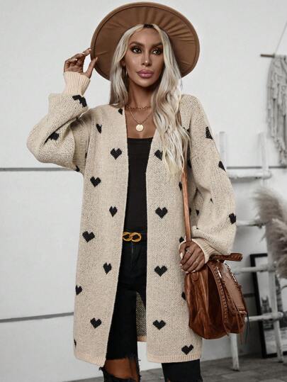 SHEIN LUNE Heart Pattern Drop Shoulder Cardigan,Long Sleeve Tops Fall Winter Cloth For Women - Khaki - View 1