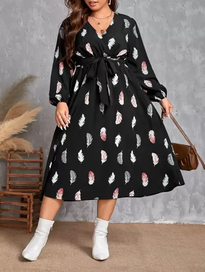 SHEIN LUNE Plus Feather Print Surplice Neck Belted Dress - Black - View 1