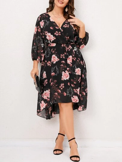 SHEIN LUNE Plus Floral Print Lantern Sleeve High Low Hem Dress - Black - View 1