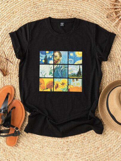 SHEIN LUNE Plus Graphic Print Crew Neck Tee - Black - View 1