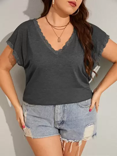 SHEIN LUNE Plus Lace Trim Batwing Sleeve Tee - Dark Grey - View 1