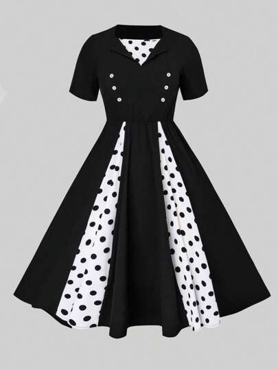 SHEIN Clasi Plus Polka Dot Print Flare Hem Dress - Black and White - View 1