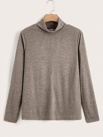 SHEIN LUNE Plus Size High Neck Long Sleeve T-Shirt - Coffee Brown - View 1