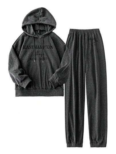 SHEIN LUNE Plus Size Women's Letter Printed Hooded Sweatshirt And Pants Set With Drawstring - Grey - View 1
