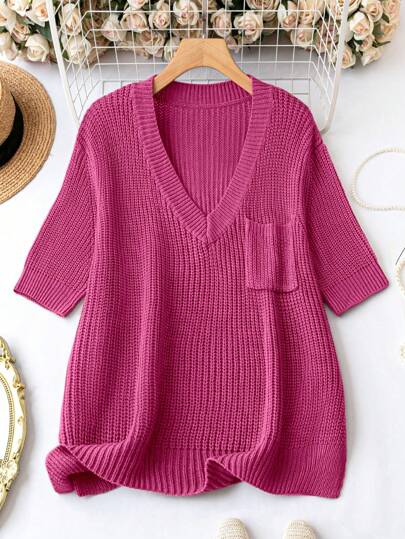 SHEIN LUNE Plus Size Women's Short Sleeve Knitted Top With Pocket - Hot Pink - View 1