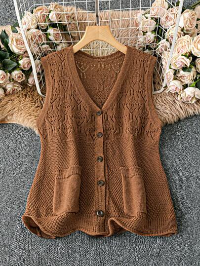 SHEIN LUNE Plus Size Women's Spring & Autumn V-Neck Hollow Out Single-Breasted Pockets Knit Top - Brown - View 1