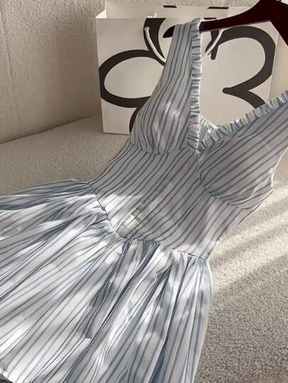 SHEIN LUNE Striped V-Neck Ruched A-Line Waisted Elegant Women Mini Dress - Blue - View 1