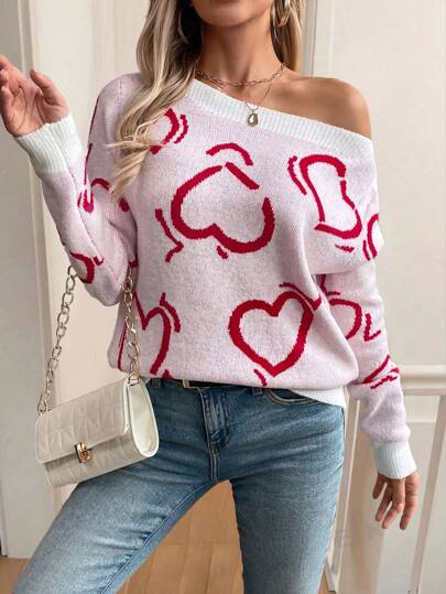 SHEIN LUNE Sweet & Heart Print Asymmetrical-Shoulder Knit Sweater, Knit Pullover Fall Winter - Multicolor - View 1