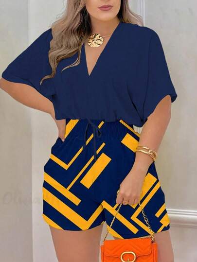 SHEIN LUNE V-Neckline Spaghetti Straps Backless Printed Jumpsuit With Waist Tie And AB Material Patchwork - Navy Blue - View 1