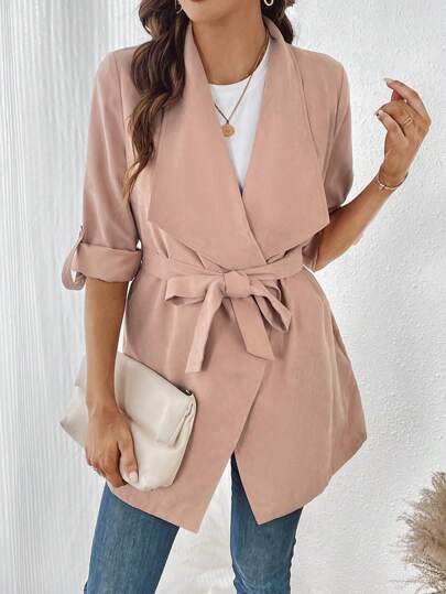 SHEIN LUNE Waterfall Collar Roll Tab Sleeve Belted Coat - Baby Pink - View 1