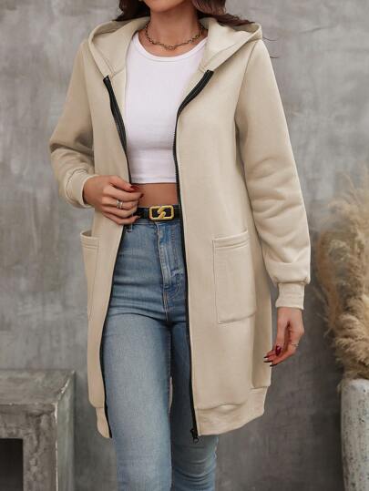 EMERY ROSE Women's Solid Color Zipper Front Hoodie With Double Pockets - Apricot - View 1