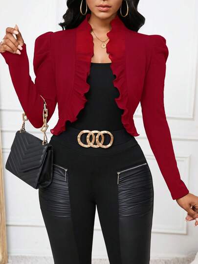 SHEIN Lady Plus Size Elegant Solid Color Puff Sleeve Ruffle Hem Short Jacket For Autumn Winter Fall - Red - View 1
