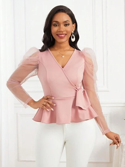 SHEIN Lady Women's Leg-of-mutton Sleeve Blouse With Ruffle Hem & Knot Detail - Pink - View 1