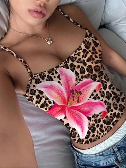 SHEIN Leap Crew Teen Girls Casual Minimalist Leopard Print Lily Flower Camisole Tank Top, Summer - Multicolor - View 1