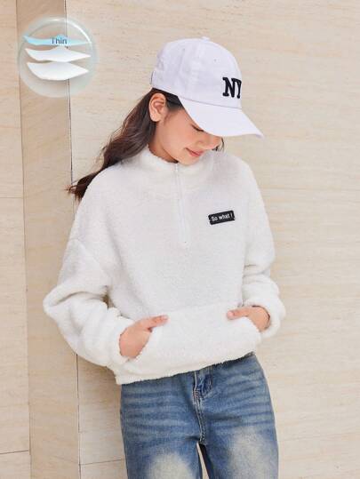 SHEIN Little Byeori Tween Girl Slogan Patched  Pocket Half Zip Teddy Sweatshirt,In Fall/Winter - White - View 1