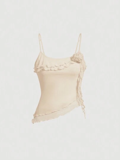 SHEIN MOD 3D Rosette Frill Trim Asymmetrical Hem Cami Top - Beige - View 1