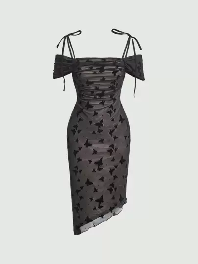 SHEIN MOD Butterfly Print Ruched Asymmetrical Hem Mesh Dress - Black - View 1