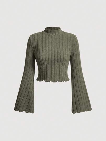 SHEIN MOD Mock Neck Lettuce Trim Trumpet Sleeve Lettuce Trim Tee - Green - View 1