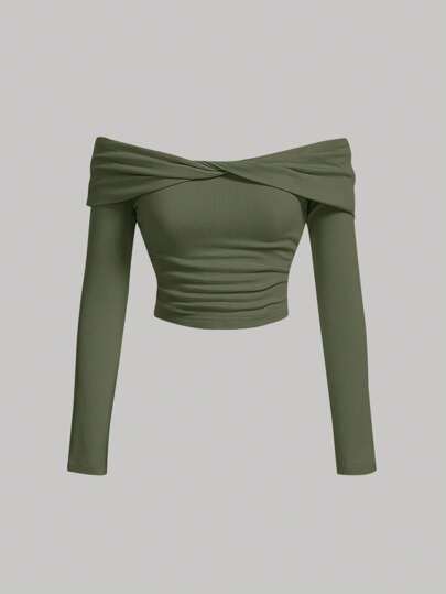 SHEIN MOD Off Shoulder Twist Front Tee - Army Green - View 1