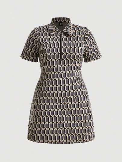 SHEIN MOD Plus Allover Print Half Zip Dress - Blue - View 1