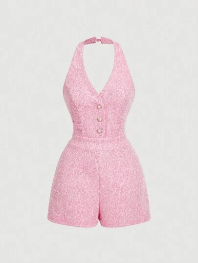 SHEIN MOD Women Tweed V-Neck Sleeveless Pearl Button Jumpsuit, Pink Jumpsuit,Professional Women Clothes,Office Women Outfits,Summer Women Dresses - Pink - View 1