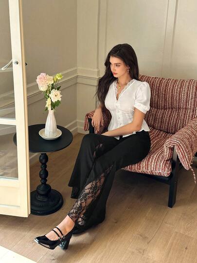 SHEIN MOD Women's Vintage Contrast Lace Flare Pants, Spring - Black - View 1