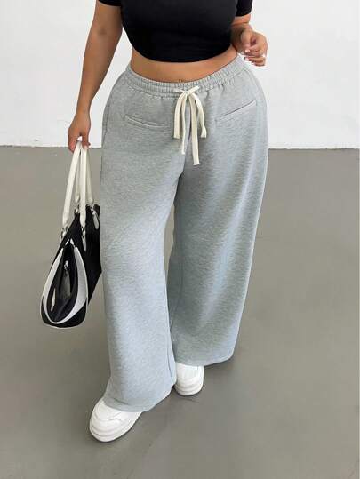 Flirla Plus Size Women Drawstring Waist Wide Leg Loose Casual Sweatpants - Grey - View 1
