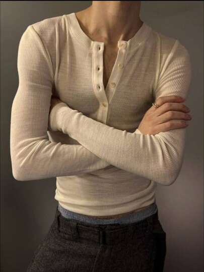 SHEIN Manfinity Dauomo Men's Casual Versatile Solid Color Half-Button T-Shirt - Apricot - View 1