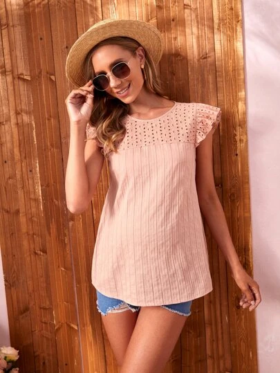 SHEIN Maternity Butterfly Sleeve Eyelet Embroidery Yoke Top - Coral Pink - View 1