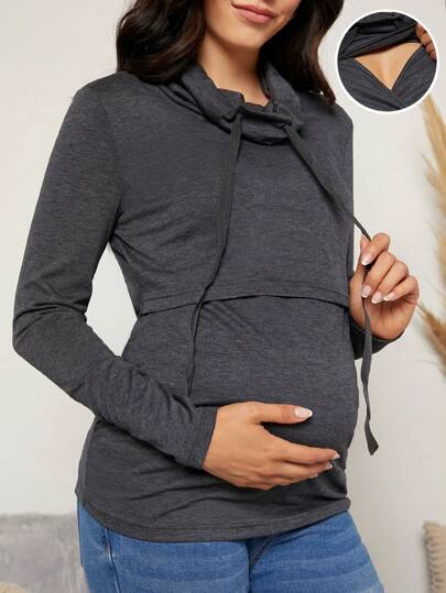 SHEIN Maternity Drawstring Detail Nursing Tee With Long Sleeve - Dark Grey - View 1