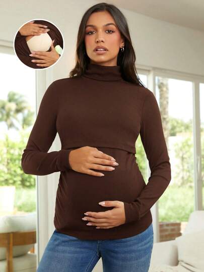 SHEIN Maternity Stand Collar Long Sleeve T-Shirt - Brown - View 1