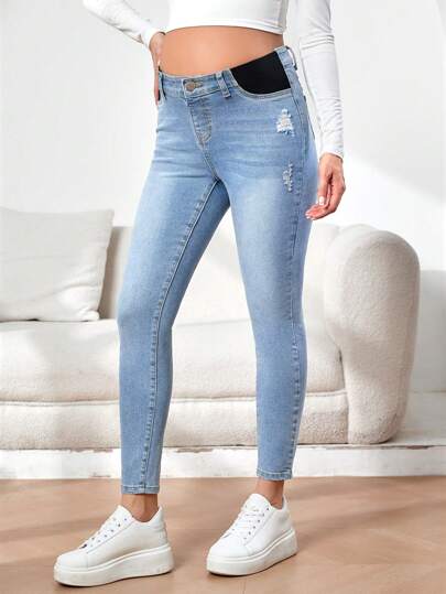 SHEIN Maternity Simple Washed Ripped Daily Wear Skinny Jeans Mom Jeans - Light Wash - View 1