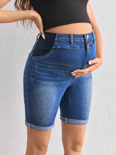 SHEIN Maternity Skinny Stretch Denim Capri Shorts With Rolled Hem, Blue - Blue - View 1