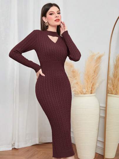 Modelyn Burgundy Red Choker Neck Cable Knit Bodycon Sweater Dress - Burgundy - View 1