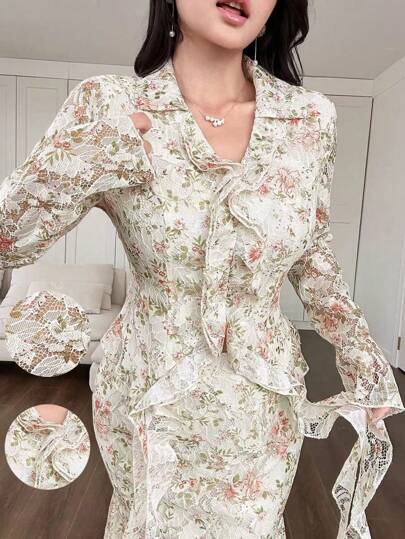 Modelyn Lace Printed Ruffled Fishtail Slim Fit Two-Piece Suit For Women - Multicolor - View 1