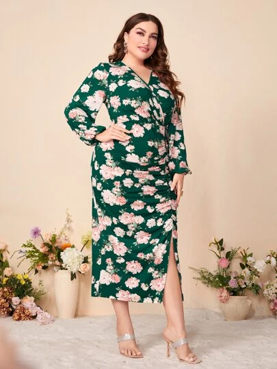 Modelyn Plus Floral Print Ruched Split Thigh Dress - Multicolor - View 1