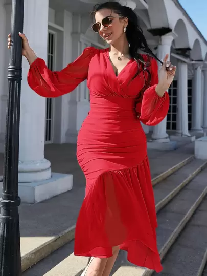Modelyn Solid Surplice V Neck Puff Sleeve Ruched Mermaid Hem Dress - Red - View 1
